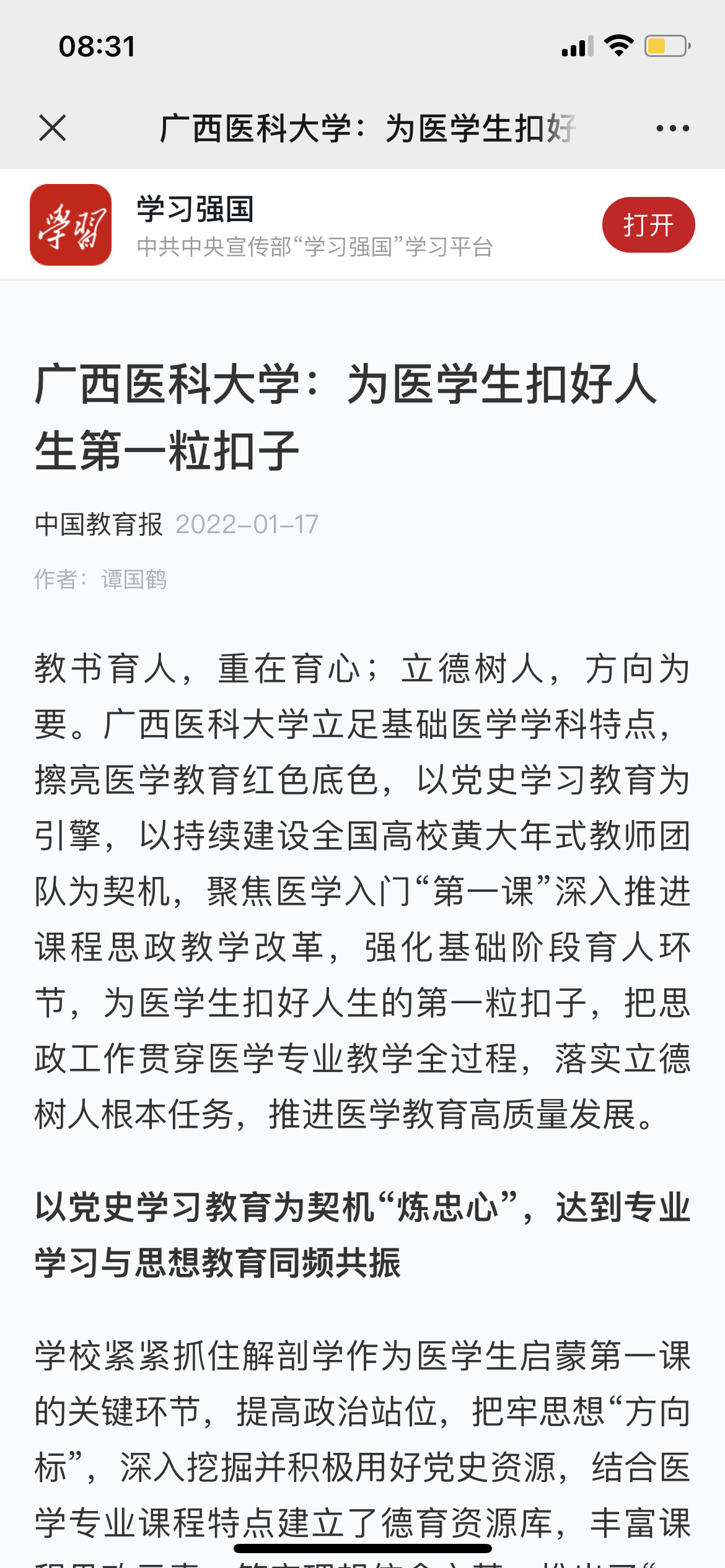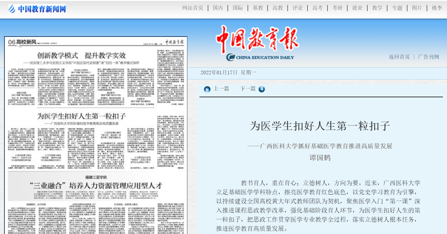 2022年1月17日,长寿与老年教育部重点实验室主任谭国鹤教授在《中国教育报》发表重要理论文章《为医学生扣好人生第一粒扣子——广西医科大学抓好基础医学教育推进高质量发展》,并被“学习强国”刊登转载推广学习。