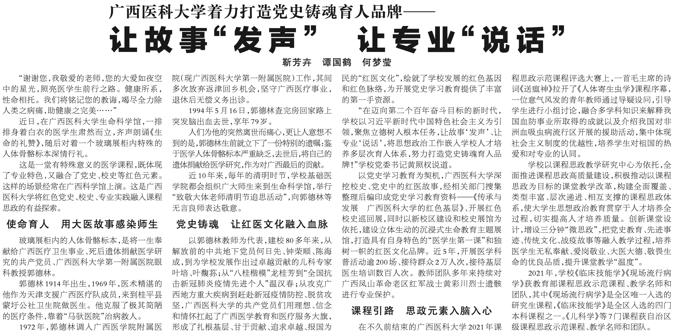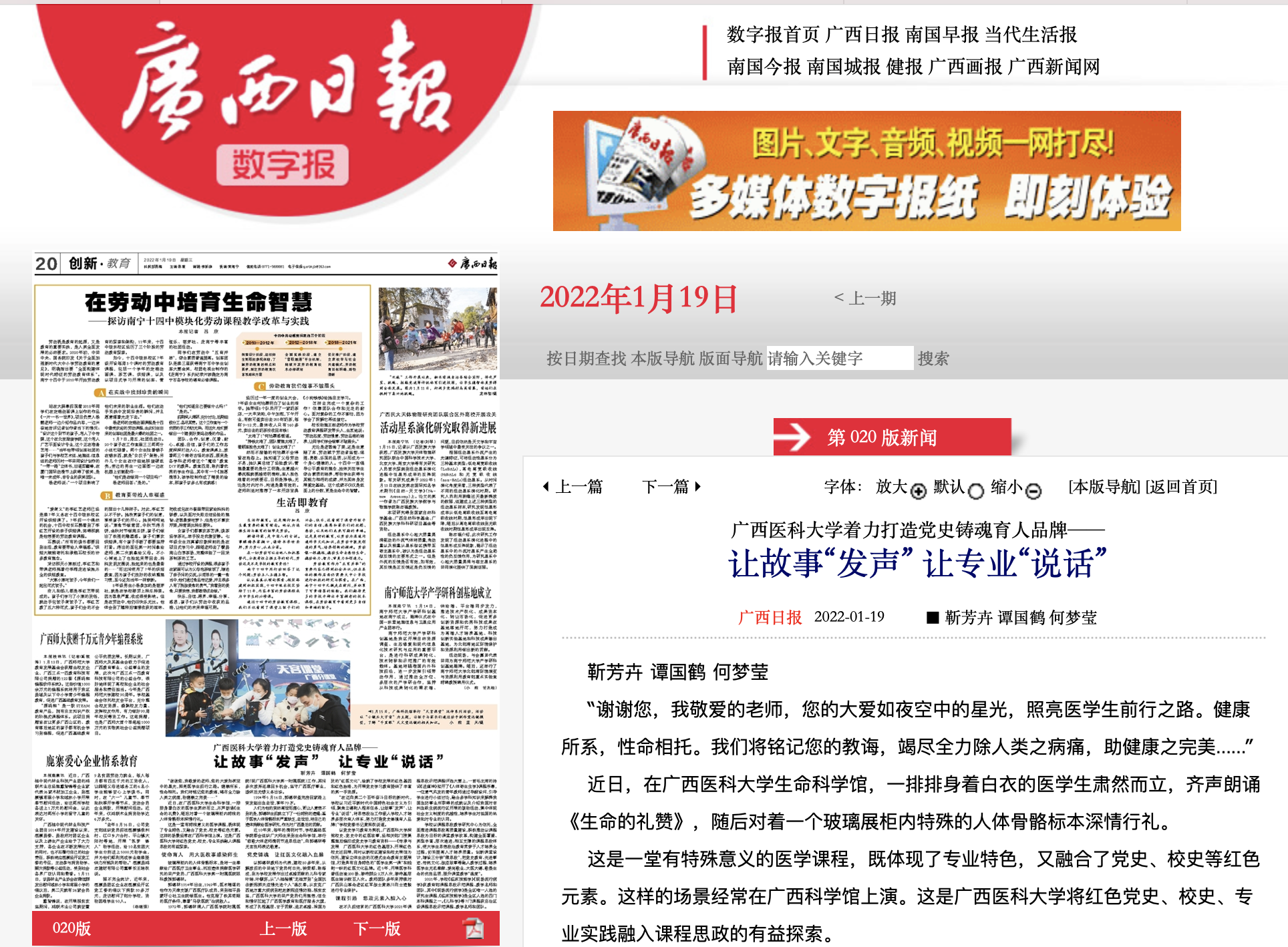 2022年1月19日,《广西日报》刊登我重点实验室主任谭国鹤教授参与合著的理论文章《广西医科大学着力打造党史铸魂育人品牌——让故事“发声” 让专业“说话”》